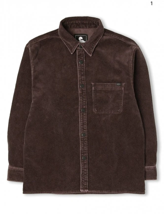 The Edwin Ander Shirt in Raisin is an 8 ribs corduroy fabric with patched pockets and Edwin branded buttons on the front and cuffs. The shirt contains a stitched label and is stone washed. The product is oversized fitting and was manufactured in Tunisia.