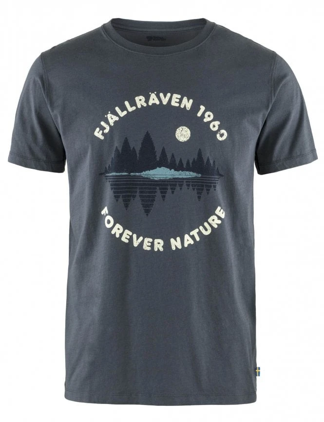 This Fjallraven Mirror Tee is a sustainable jersey that combines the softness of organic cotton with the functionality and durability of recycled polyester. Wicks away moisture and dries quickly making it ideal for warm weather. The front has a print and has a round neckline.