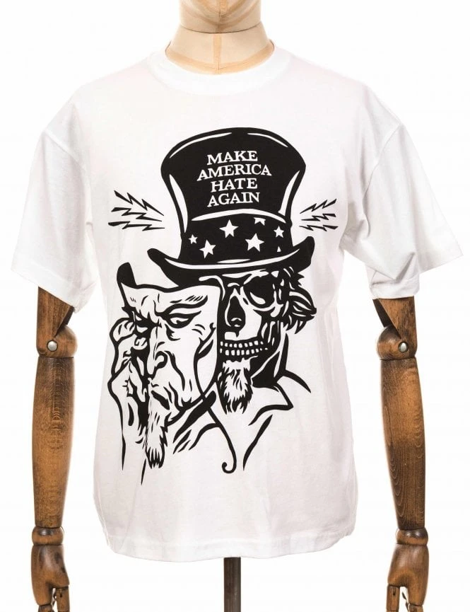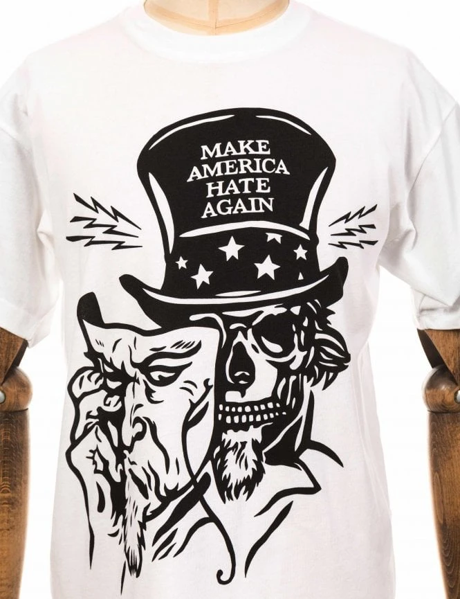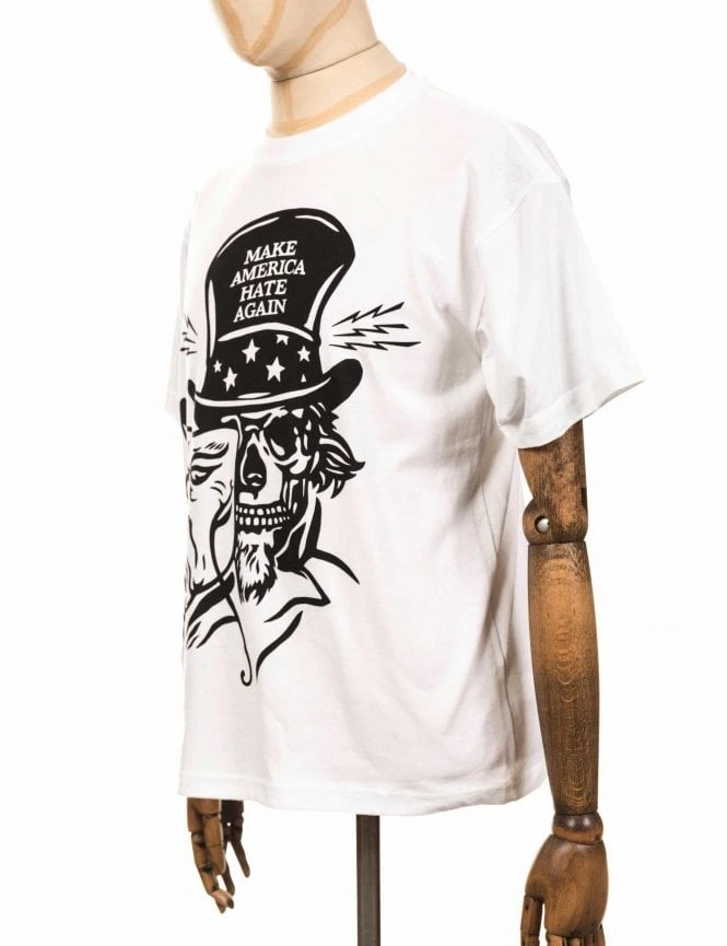 This Obey Make America Hate Again Superior Tee in White is constructed of 52% Recycled Polyester and 48% Recycled Cotton. A contrasting print is clearly invisible on the front.