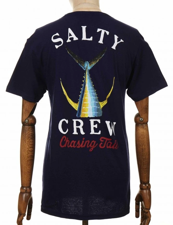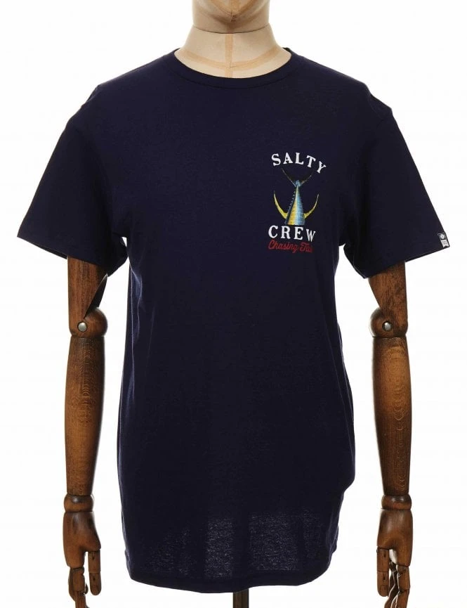 A Salty Crew Tailed Tee in Navy, 100% Combed Ring-spun cotton in standard fit is a perfect tee on its own or under a leather jacket, these come with a print in the front and in the back.